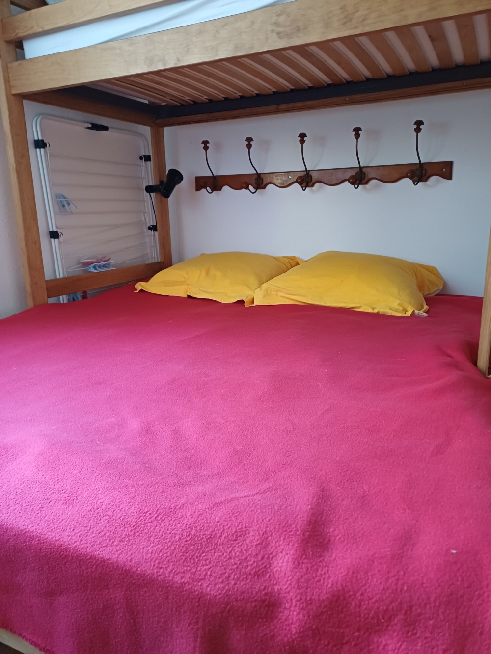 Entrée possible par la partie commune ou par son séjour, ce dernier est doté d'une cuisine toute équipée et optimisée, d'un bon lit convertible dépliant, d'un dégagement avec rangement : menant à sa petite chambre avec rangements, lits superposés et gigogne et bureaux dépliable et menant également à une salle de bain avec wc et sèche serviette.